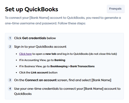 In response, you will receive login credentials that your user needs to enter in QBO Banking to linkLink The authorization flow that allows end users to connect their accounting, banking, or commerce platforms to your application via Codat. a bank account. Share them with the user, and consider providing instructions on steps to take in QBO. For example, this is how we manage it in our QBO LinkLink The authorization flow that allows end users to connect their accounting, banking, or commerce platforms to your application via Codat. flow: